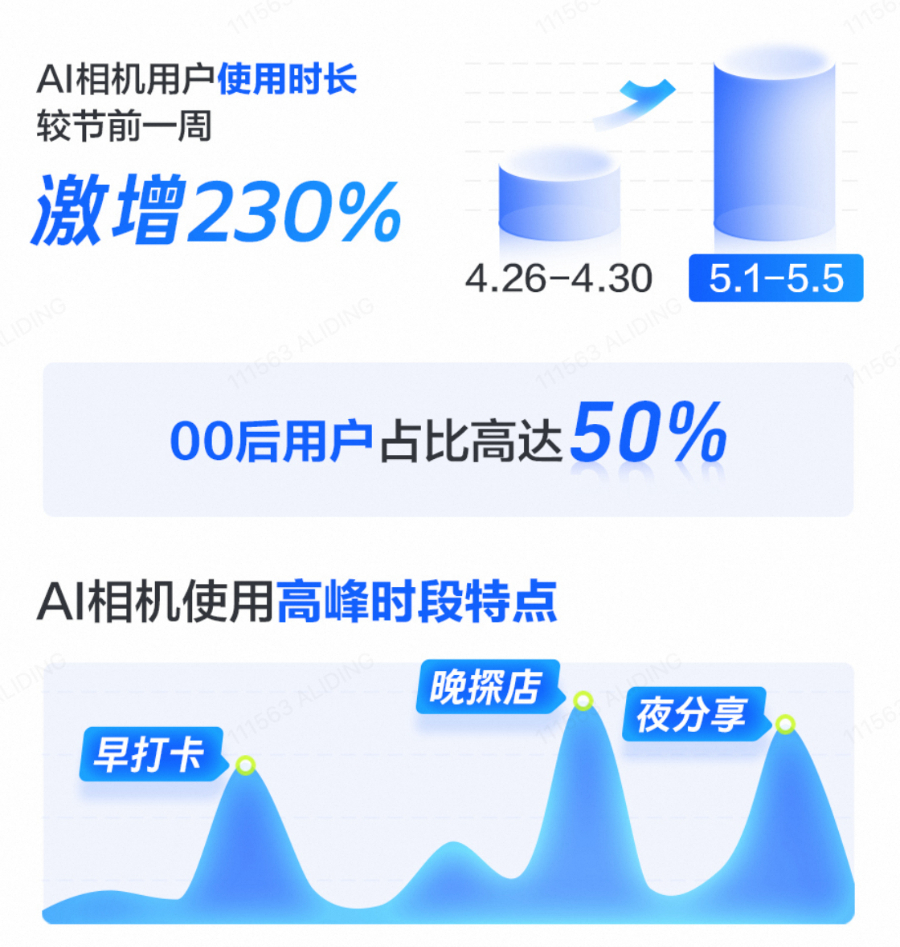 这个五一假期,00后用AI重新定义了人间烟火气。从行程规划、购物比价到实时翻译、美食探索,AI相机成为年轻人解锁假期美好瞬间的新宠。夸克发布的《年轻人五一注意力报告》数据显示,AI相机用户使用时长较节前一周激增230%。其中,24岁以下的00后用户占比高达50%。与此同时,AI相机的使用高峰呈现出明显的"早打卡、晚探店、夜分享"特征——上午9-11点的景点导览、傍晚17-19点的美食探索以及夜间20-22点的社交内容创作需求高涨。