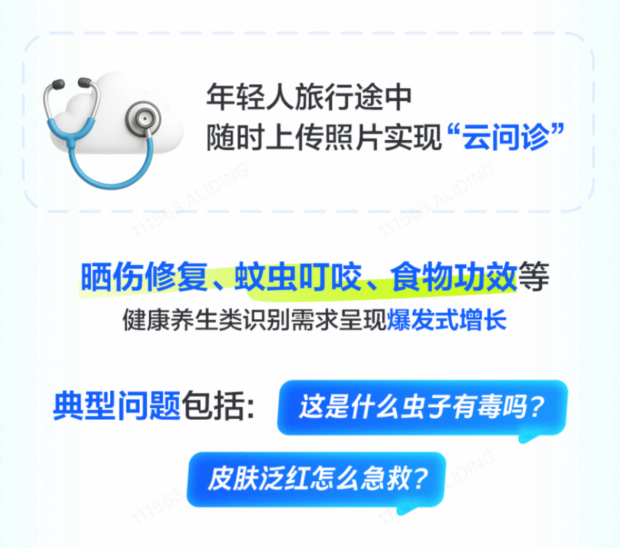健康养生也成为年轻人五一假期的关注点。利用“拍照问夸克”分析手相、舌象需求激增。不少年轻人在旅行途中还会随时上传照片实现“云问诊”。晒伤修复、蚊虫叮咬、食物功效等健康养生类识别需求呈现爆发式增长,典型问题包括“皮肤泛红怎么急救?”和“这是什么虫子有毒吗?”。