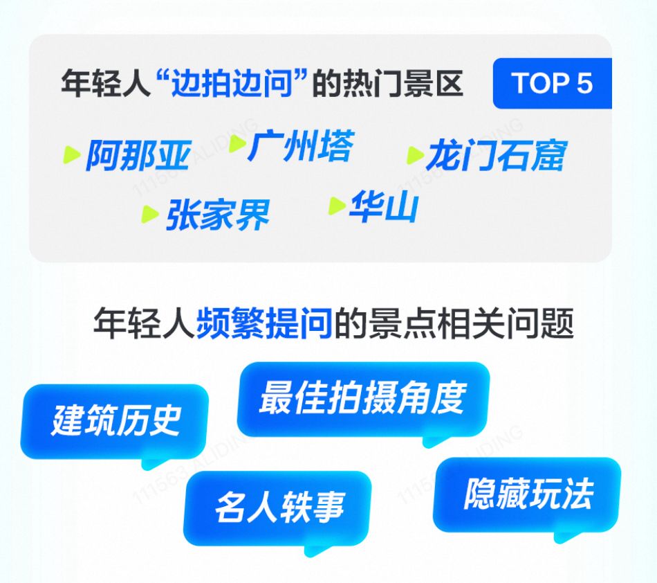对于很多年轻人来说,AI相机在假期旅行中扮演着“全能导游”的角色。阿那亚、广州塔、龙门石窟、张家界、华山等地成为年轻人“边拍边问”的Top5热门景区,用户频繁提问“建筑历史”“最佳拍摄角度”“隐藏玩法”“名人轶事”等各式问题。年轻人不再满足于简单拍照打卡,而是通过提出问题,沉浸式了解景点信息和,探索文化内涵。