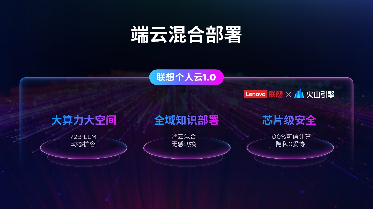 张华强调,“超级安全,是天禧个人超级智能体的重要能力。端云混合架构,将硬件芯片级加密安全能力延伸至云端。”联想与火山引擎共建的可信秘密云方案,将为每一次的AI执行 提供强大的数据安全和隐私保护。通过端云混合架构,天禧个人超级智能体做到了将硬件芯片级加密安全能力延伸至云端。应用TEE加密、可信传输和计算容器等核心技术,构建起安全壁垒,确保终端和个人云之间的每一次数据传输与每一次推理计算都安全无虞。依托端云混合架构的联想天禧个人超级智能体,为联想AI终端注入强劲动能,实现技术突破。
