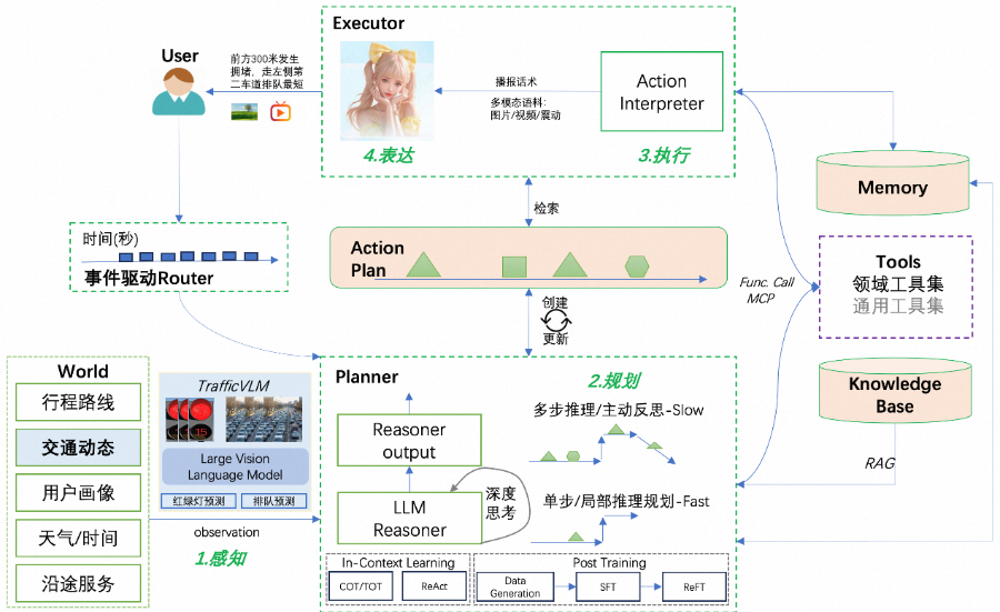 高德地图作为专业领先的出行和位置服务解决方案提供商,长期致力于以技术为本,为用户打造一张高效精准、便捷丰富的“活地图”。近两年来,更是积极投入了人工智能等前沿领域,并应用Planner-Executor创新技术理念和架构,推出了集“感知、规划、执行、表达”的全链路AI导航智能体,为高德地图APP用户提供独树一帜的导航服务体验。