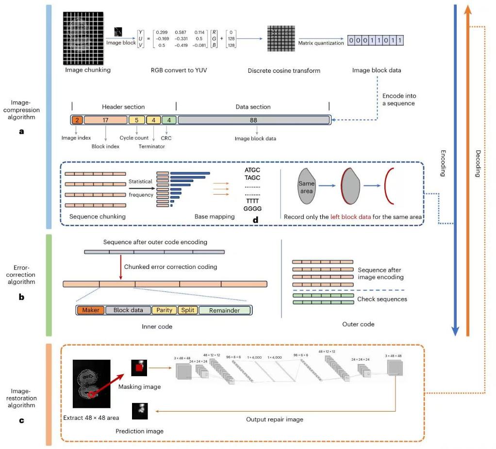 在实验室中,研究团队成功将两张共60MB的时空组学图像编码为13万条、每条183个碱基的DNA序列,并通过DNA合成与测序技术,成功恢复了图像数据。