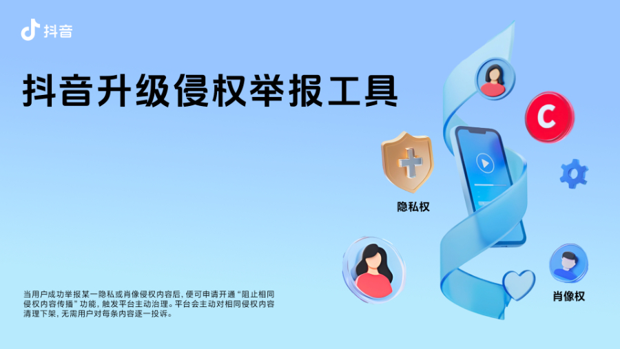 5月22日,抖音平台宣布对其侵权举报服务进行升级,在肖像权、隐私权侵权情形下,支持用户授权开通“阻止相同侵权内容传播”功能,大幅降低重复侵权投诉的成本,探索“一次投诉、长期管控”的治理目标。
