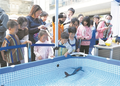 图为公众在科学展示区观看水下仿生机器鱼。本报记者 洪星摄