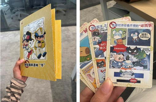 卡游认为反欺凌卡牌的价值恰在于消解这种认知盲区。卡游还在设计中特别加入“旁观者干预”情景,如“看到同学被欺凌该如何行动”,通过正反案例对比,引导学生克服“责任分散效应”,从“沉默的大多数”转变为“积极的干预者”。