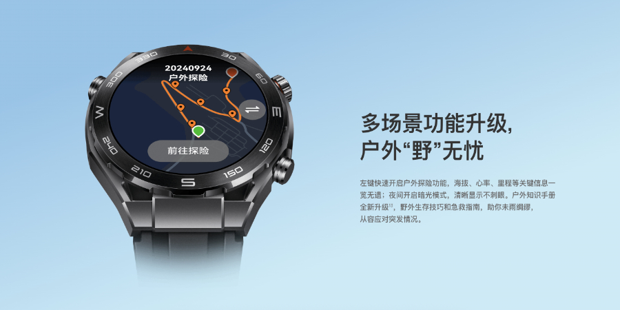 此外,手表还支持多种户外探险模式,包括专业户外探险数据显示、位置点连续标记、标记返航等功能。在登山滑雪过程中,张京可以利用这些功能记录自己的行进轨迹和关键位置点,确保在需要时能够安全返航。同时,手表还提供了恶劣天气预警、日出日落、月相、潮汐等户外环境信息显示功能,帮助张京及时了解环境变化,规避潜在风险。