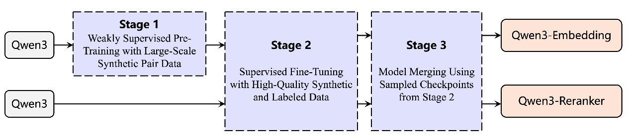 向量模型像是AI的“翻译器”,它可以将文本、图片等人类可认知的非结构化信息,映射到机器更易理解的向量空间,再基于这些向量实现高效的信息分类、检索或排序。也正因此,向量模型对于提升AI的语义理解、信息检索、多模态融合等核心能力至关重要。基于千问3模型,通义团队通过对比训练、SFT、模型融合等方法,打造出全新的千问3向量模型,包含文本嵌入模型 Qwen3-Embedding以及文本排序模型Qwen3-Reranker。