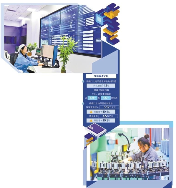 作为数字经济的核心产业之一,电子信息制造业规模总量大、产业链条长、涉及领域广,是推动实体经济与数字经济深度融合、培育壮大新质生产力的重要领域。工业和信息化部数据显示,今年前4个月,规模以上电子信息制造业增加值同比增长11.3%,增速分别比同期工业、高技术制造业高4.9个和1.5个百分点。