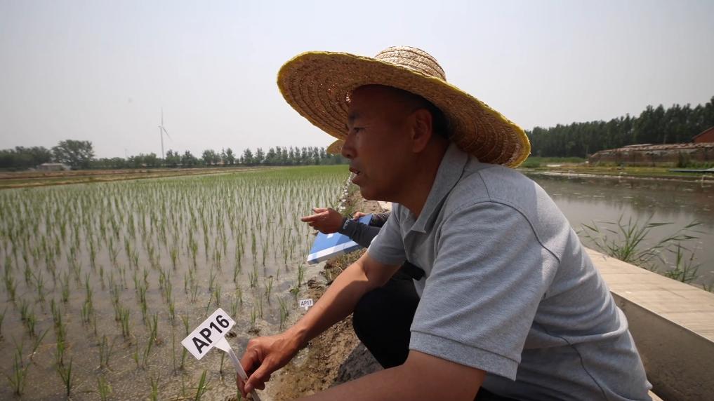 在天津市优质农产品开发示范中心的水稻育秧基地,新栽种的一排排种苗长势喜人。于福安蹲在地头,细细查看。