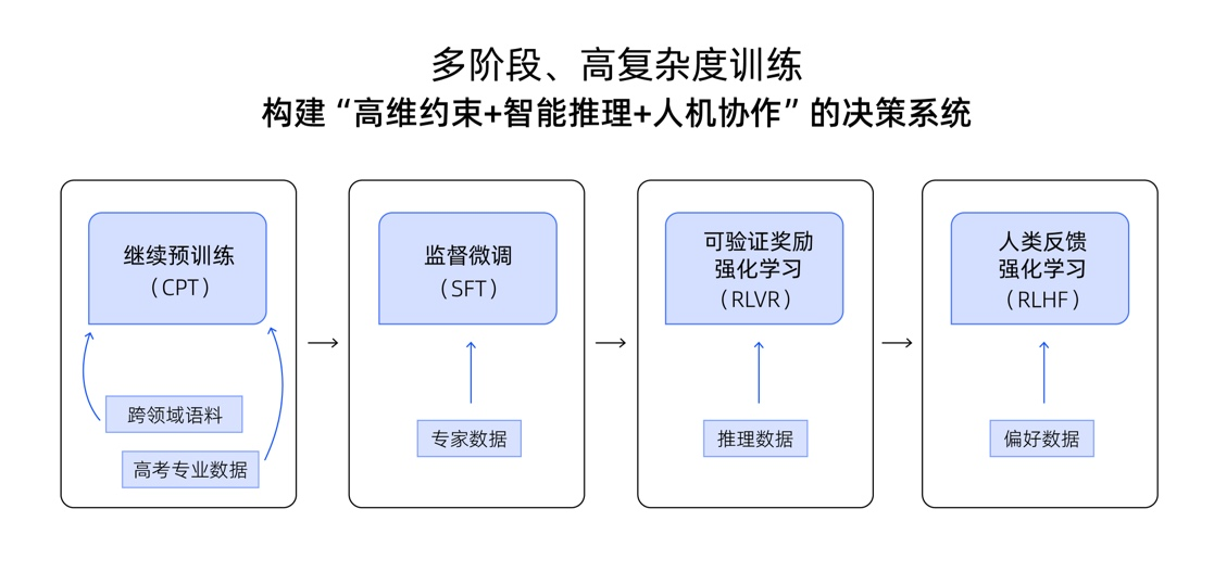 夸克高考志愿大模型的专业性源自其严谨且创新的训练机制。该模型以通义千问为基座,通过多阶段、高复杂度的训练范式,深度还原人类志愿填报专家的思考逻辑与决策过程。在指令微调阶段,夸克邀请数百名资深高考志愿规划师深度参与,将他们与考生或家长的海量真实对话进行结构化处理,提炼出上万条专家“推理链”,形成高质量监督数据,使模型能够深度学习专家的分析路径与决策智慧。