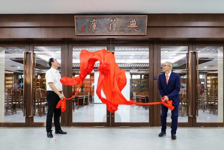 同日揭幕的“典籍库”位于陈一丹伉俪图书馆七楼。库内悬挂国学泰斗饶宗颐先生题写的匾额,收藏由陈一丹捐资购置的 5200余册(套)典籍。馆藏包括《文津阁四库全书》《永乐大典(辑佚本)》《儒藏》等重要典籍,1904—1948年全套《东方杂志》影印本,以及《湖北通志》《荆楚文库》等地方文献系统收藏。“典籍库”集古籍阅览、学术研讨、文化展览于一体,将依托数字校园建成“荆楚文化典籍数据库”,并常态化举办“典籍中的中国”展览及古籍修复体验课。