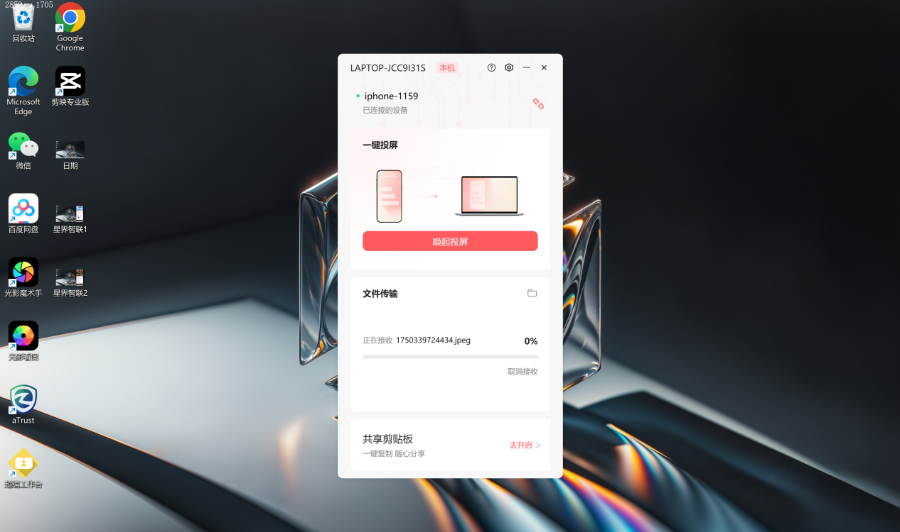 在跨设备协作功能方面,机械革命开发了“星界智联”应用套件。该功能支持Android/iOS/Windows全平台互通,用户只需将手机与笔记本接入同一网络,即可实现文件互传、共享剪贴板、屏幕投射等操作。值得注意的是,在投屏功能中,机械革命创新地加入了“应用级投屏”选项,用户可以将手机中的单个应用投屏至笔记本,隐藏通知栏、消息提醒等敏感信息,避免了传统全屏投射可能带来的隐私泄露风险。“星界智联”的应用打破了设备间的壁垒,提升了跨设备协作的效率,为用户带来了更加便捷、高效的数字化办公与生活体验。