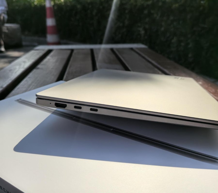 面对传统轻薄本常因材质强度不足导致的机身变形问题,星耀14采用了全镁合金材质,并特别将C面厚度增加至1mm。在转轴、边框等关键部位进行了强化处理,确保了机身的坚固耐用性,同时实现了轻量化目标。其仅1kg的重量与14.9mm的厚度,使其在同类产品中脱颖而出,极大地方便了用户的携带,可以轻松塞进背包,就像揣着一本杂志出门。与常见的13英寸轻薄本相比,14英寸的大屏并没有带来“臃肿感”,反而提供了更开阔的视觉享受。此外,圆润的边角设计贴合人体工程学原理,进一步提升了握持的舒适度,减少了使用过程中的不适感。