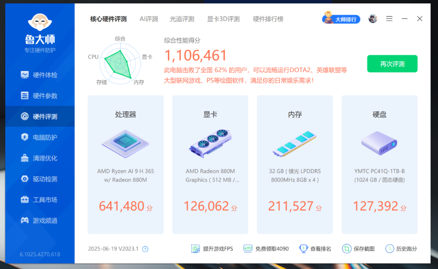 性能是衡量笔记本电脑优劣的核心指标。为了符合Windows11 AI+PC的标准,笔记本的NPU至少需要释放40TOPS的峰值性能。机械革命星耀14拥有AMD锐龙AI9H365和AMD锐龙7H255两个版本,采用台积电4nm制程与Zen5架构,具备10核20线程设计,最高频率可达5GHz,集成Radeon880M显卡及50TOPS算力的NPU。这些配置进一步证明了其在日常办公及生产力场景下的卓越性能。在鲁大师硬件测评中,星耀14以1106461的综合性能得分,超过了全国62%的用户。