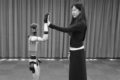 近日,在知名机器人公司杭州宇树科技展厅内,宇树人形机器人G1展示击掌动作。 新华社记者 黄宗治 摄