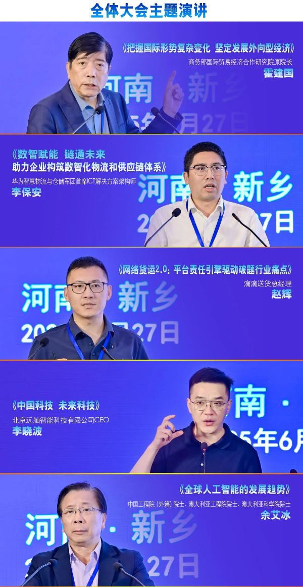 在全体大会上,商务部国际贸易经济合作研究院原院长霍建国、华为智慧物流与仓储军团首席ICT解决方案架构师李保安、滴滴送货总经理赵辉、北京远舢智能科技有限公司CEO李晓波、中国工程院(外籍)院士、澳大利亚工程院院士、澳大利亚科学院院士余艾冰,分别以《把握国际形势复杂变化 坚定发展外向型经济》《数智赋能 链通未来 助力企业构筑数值化物流和供应链体系》《网络货运2.0:平台责任引擎驱动破题行业痛点》《中国科技 未来科技》《全球智能化发展趋势》为主题进行了精彩的演讲。