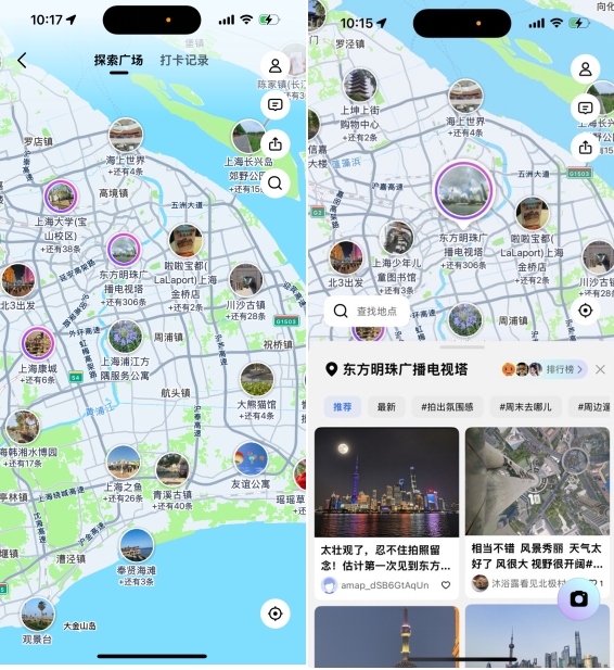 除了创新的打卡交互形式,高德地图AR打卡还通过智能算法,基于用户位置及历史偏好,精准推荐周边的宝藏打卡点。无论是小众咖啡馆、艺术展览,还是网红拍照圣地,都能被一一挖掘,帮助用户发现新奇的人和事,开启沉浸式探索体验。若用户想要获取更多灵感,可通过打卡页面左下角“探索”按钮,或在点击主页气泡,浏览其他用户分享的打卡内容,解锁更多趣味场景。