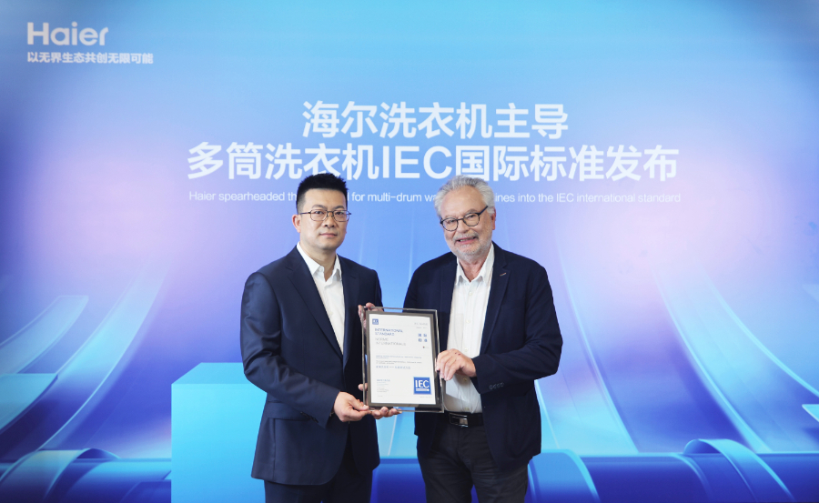 海尔主导制定的IEC多筒洗衣机国际标准,定义“多筒洗衣机”这一概念。该标准详细规定了用水、用电、洗净、漂洗及含水率等关键性能指标的测试方法,不仅填补了全球标准空白,也有力推动了产业规范化发展。