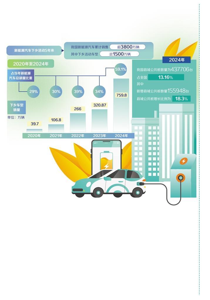 下乡车型销量及渗透率持续攀升。2020年至2024年,下乡车型销量分别为39.7万辆、106.8万辆、266万辆、320.87万辆和759.8万辆,占当年新能源汽车总销量的比重分别为29%、30%、39%、34%、59.1%。5年间,我国新能源汽车下乡活动车型累计销售近1500万辆。