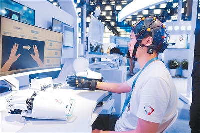 第十一届中国(上海)国际技术进出口交易会上的一款人工智能多模态脑机接口系统。 逸 成摄(影像中国)