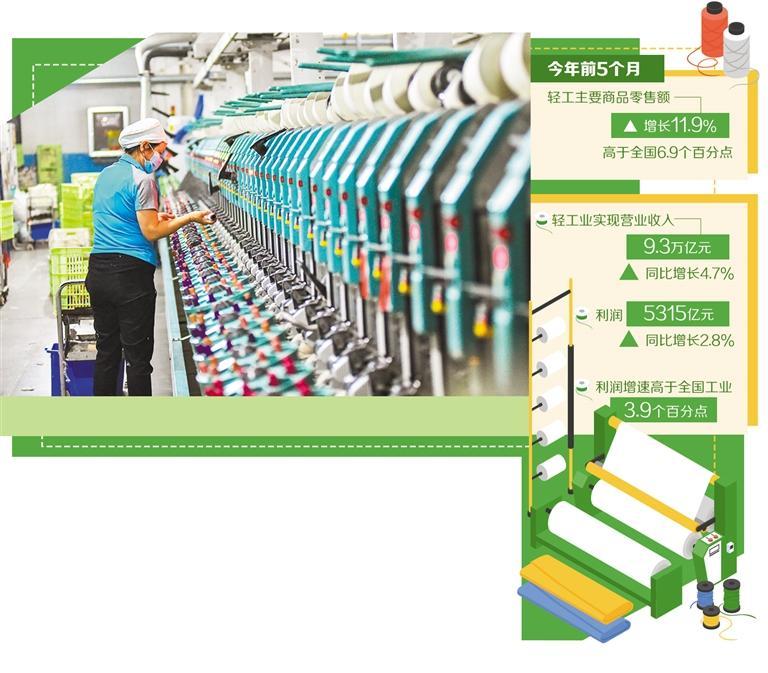 中国轻工业联合会发布的数据显示,今年前5个月,轻工主要商品零售额增长11.9%,高于全国6.9个百分点;家电类商品增长30.2%,家具类商品增长21.4%。轻工业实现营业收入9.3万亿元,同比增长4.7%;利润5315亿元,同比增长2.8%;利润增速高于全国工业3.9个百分点。