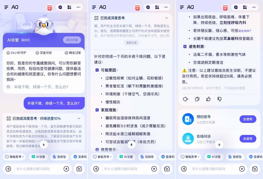 AQ是蚂蚁在医疗健康领域的战略级应用,通过自研医疗大模型能力,向用户提供寻医、问诊、读报告、测健康等上百项AI服务,同时与近百万真实医生、超5000家公立医院等专业服务链接。此前,AQ在6月26日已上线安卓等主要应用市场。