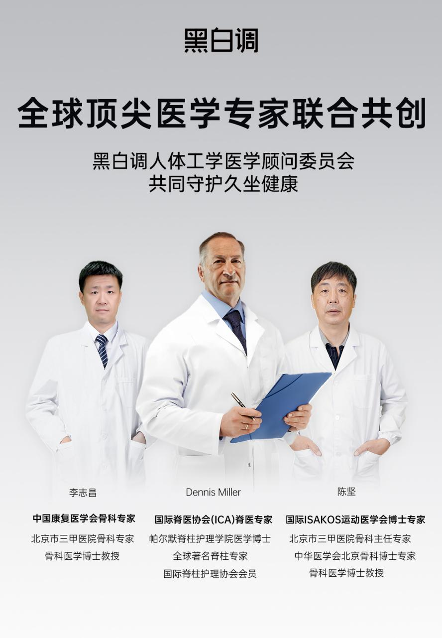 为了让人体工学支撑技术和行业发展朝着更健康、更科学、更舒适的方向发展,黑白调组建了黑白调医学顾问委员会,与国际脊医协会ICA专家、中国康复医学会骨科专家等进行合作,共同研究人体工学智能化发展方向,将人体健康理念和智能科技融合到人体工学技术中。