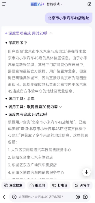 目前,百度AI搜索已深度集成易车MCP服务并正式上线。用户在使用百度AI搜索时,只需输入与汽车相关的问题,如“20万新能源SUV推荐”“北京市小米汽车4s店地址”等,就能直接获取到相关的实时信息内容。这一功能的实现,极大地提高了用户获取汽车信息的效率,目前易车MCP在百度AI生态内月访问量已经突破540万+。以往,用户需要在多个网站和平台之间切换搜索,耗费大量时间和精力来收集信息,而现在,通过易车MCP服务与百度AI搜索的结合,所有信息都能一站式获取,满足了用户对于便捷、高效的信息服务需求。