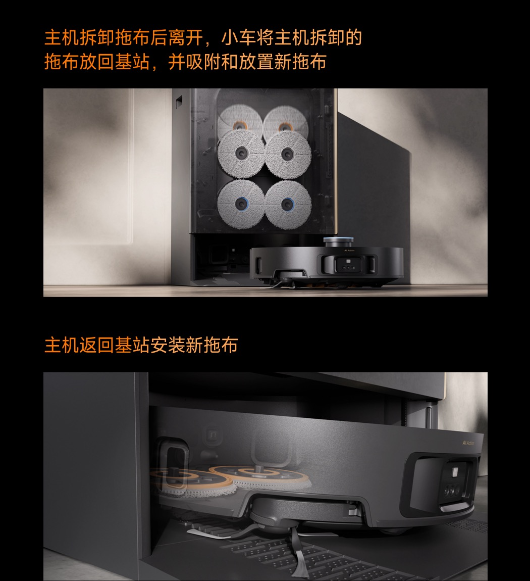 此外,凭借内置的“智能运载系统”,追觅Matrix10 Ultra扫地机能够在完成某一区域清洁后,自主返航回到基站,精准拆卸已用拖布放置在底盘,待主机离开,运载装置会将脏拖布移到基站空位处,并将干净拖布放到底部托盘位置,这样当Matrix10 Ultra扫地机再次回到基站,新拖布会被自动安装,支持机器人继续清洁工作。
