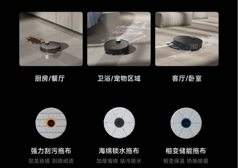 这款产品搭载追觅全球首创的自动换拖布技术,其配备的三组独立拖布模块,为厨房、卫生间等不同功能区自动匹配专属拖布,传统扫地机长期因“一块拖布擦全家”导致厨房油污、卫生间细菌与宠物等区域交叉污染的痛点,被这项技术解决,为用户提供了精细化清洁体验。