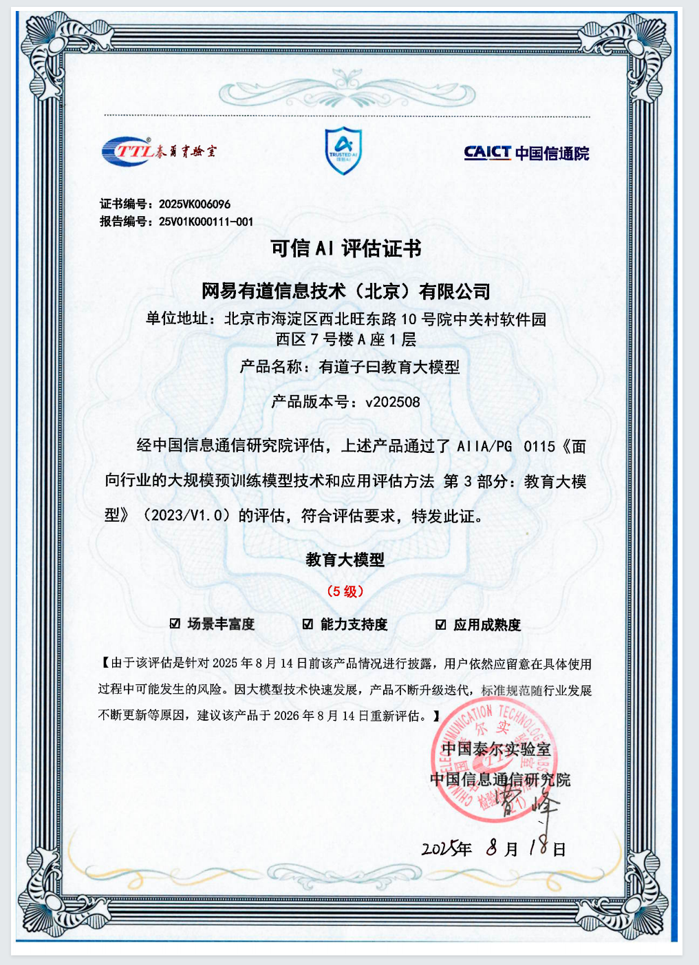 通过教育智能硬件与AI应用软件的多维创新发布,有道再次展现出其在教育大模型应用的前沿领军能力。在技术层面,有道也在持续不断优化迭代。据透露,有道子曰教育大模型已首批通过中国信通院可信AI教育大模型评估,并获得了当前最高评级5级。