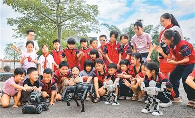 近日,首个全国科普月“八桂科普大行动贺州市科普进校园活动”在广西壮族自治区贺州市八步区灵峰镇中心学校举行。活动通过科普知识讲解和机器人、机器狗表演以及科普仪器体验等方式,激发学生创新创造意识和科学探索精神,让师生在互动与体验中感受科技的魅力。图为学生与机器人、机器狗互动。黎豪图摄(人民视觉)
