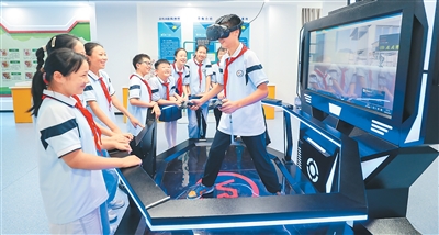 江苏省泰州市姜堰区淮海小学围绕“科技改变生活 创新赢得未来”主题,积极开展科普实践活动,组织学生走进校内科技馆进行沉浸式参观与体验,激发学生对科学知识的浓厚兴趣,感受科技为生活带来的变革与魅力。图为学生在该校校园科技馆体验VR趣味迷宫。周社根摄(人民视觉)