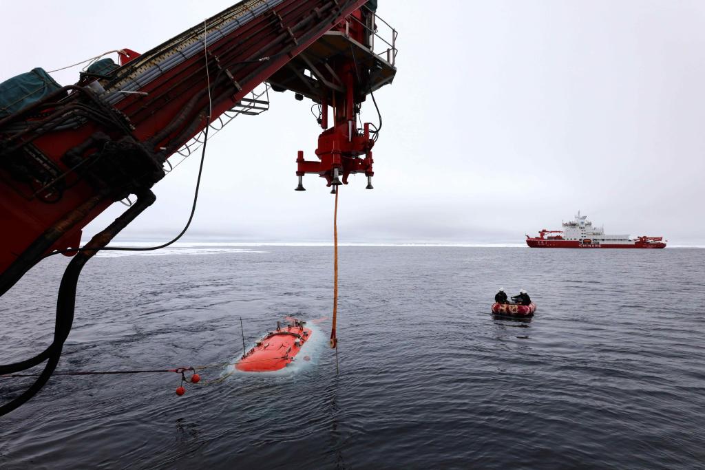 “蛟龙”号在北极冰区载人深潜。新华社记者刘诗平 摄