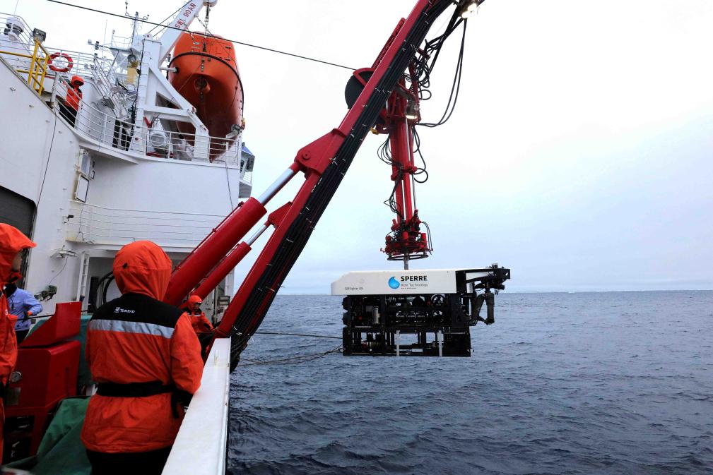 科考队员正在将ROV(无人遥控潜水器)放入水中。新华社记者刘诗平 摄
