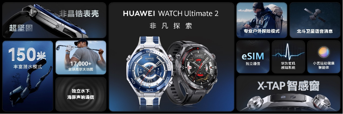 作为非凡探索系列的第二代产品,HUAWEI WATCH Ultimate 2非凡探索迎来重大升级,采用创新防水系统实现150米潜水级防水,并首发海豚声呐通信技术,实现水下双向通信与水下SOS求救。相较上一代支持的文字消息,本代首次支持北斗卫星语音消息,实现单次发送最长10秒的语音消息,户外无网络极限环境下也能及时求助。此外,基于鸿蒙操作系统6,它还支持腕上智能体,实现对运动与健康数据的快速解读;并搭载全新X-TAP智感窗,支持eSIM先锋通信,满足高端用户对运动健康与智慧生活的更高追求。