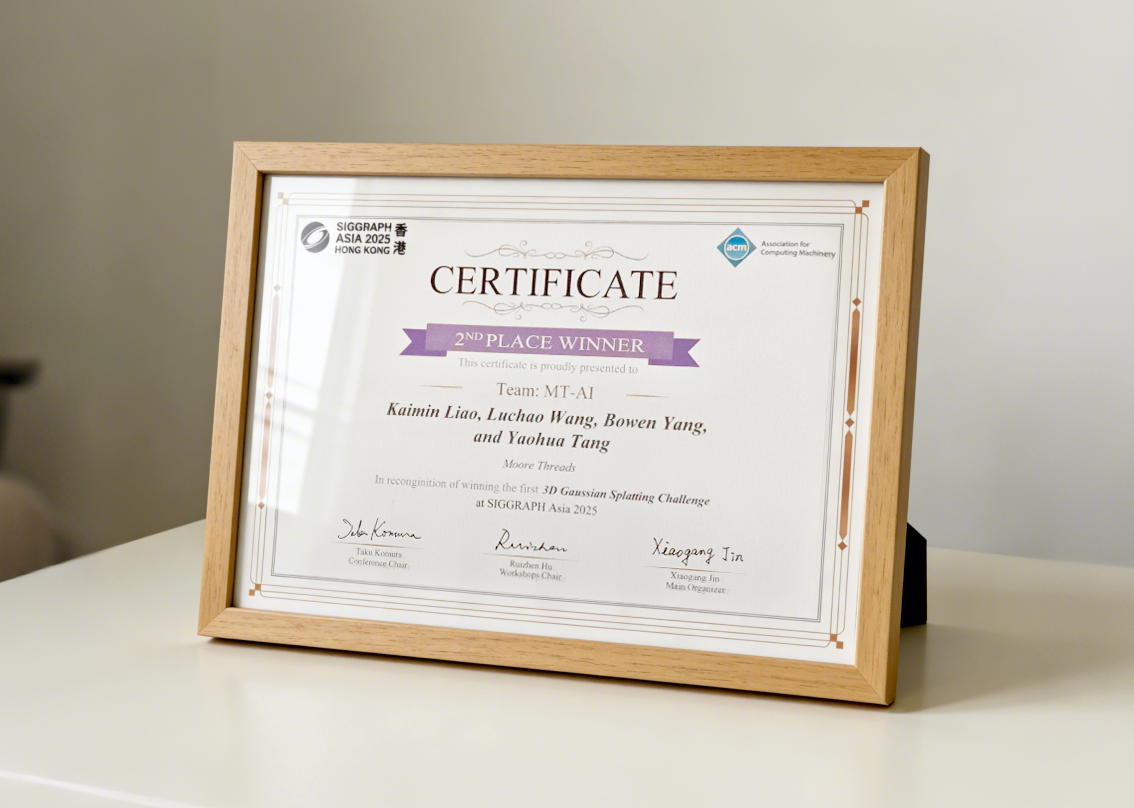 12月17日,在香港举办的全球图形学领域学术会议 SIGGRAPH Asia 2025上,摩尔线程在3D Gaussian Splatting Reconstruction Challenge(3DGS 重建挑战赛)中凭借自研技术LiteGS出色的算法实力和软硬件协同优化能力,获得大赛银奖,再次证明摩尔线程在新一代图形渲染技术上的深度积累与学术界的认可。
