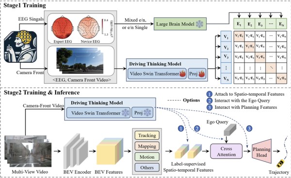 该研究的最大亮点在于其独特的两阶段训练策略。在第一阶段,模型利用脑电数据进行跨模态学习,获取驾驶认知能力;在第二阶段及实际应用中,系统仅需输入常规的车载摄像头视频数据,即可利用已习得的认知能力辅助驾驶决策,无需在车端部署脑电采集设备。这种“以脑教眼”的方式,实现了人类隐性认知知识向机器视觉模型的有效迁移。