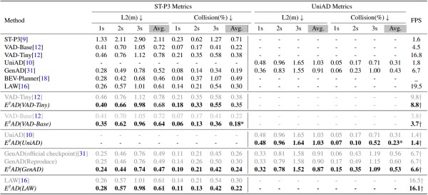 实验数据显示,该技术在公开的自动驾驶数据集nuScenes以及闭环仿真测试平台Bench2Drive上均表现优异。在引入人类认知特征后,主流端到端自动驾驶模型(如UniAD、VAD)的规划轨迹误差显著降低,碰撞率相对下降了约18%至26%。特别是在前车突然切入等高风险场景下,增强后的模型展现出了类似人类驾驶员的防御性驾驶策略,有效避免了事故发生。