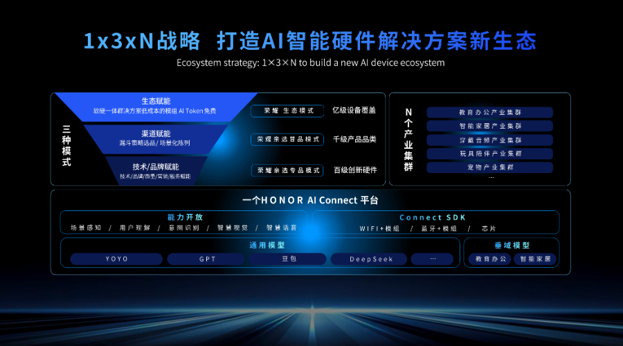 荣耀将高悬于云端的AI能力,通过端侧创新转化为亿万消费者可知可感的日常体验。从Magic8到ROBOT PHONE,在打造智慧手机进程中,荣耀始终走在前列。而端侧AI要形成真正的消费级市场浪潮,必须依靠生态的规模效应。荣耀的“1×3×N”生态战略与“用户共创、产业共生、生态共荣”理念,共同构成了其推动端侧AI规模化落地的引擎。
