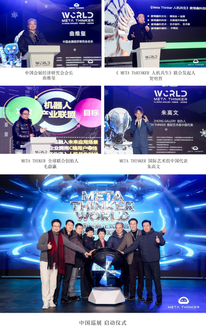 中国会展经济研究会会长曲维玺在致辞中表示对本次巡展的期望,指明了人机共生领域的发展的方向。METATHIKER全球联合创始人毛蔚瀛强调了机器人产业链的未来需求以及科技与城市发展共生的无限可能。《Meta Thinker 人机共生》联合发起人贺明哲对于Meta Thinker World城市巡展的未来规划,给予了畅想及展望。META THINKER 国际艺术组中国代表朱高文解读了科技与艺术的融合之美。Robo Space创始人兼CEO朱永强作为合作企业代表也在开幕式上对未来人机共生的时代给予了最大的支持和肯定。