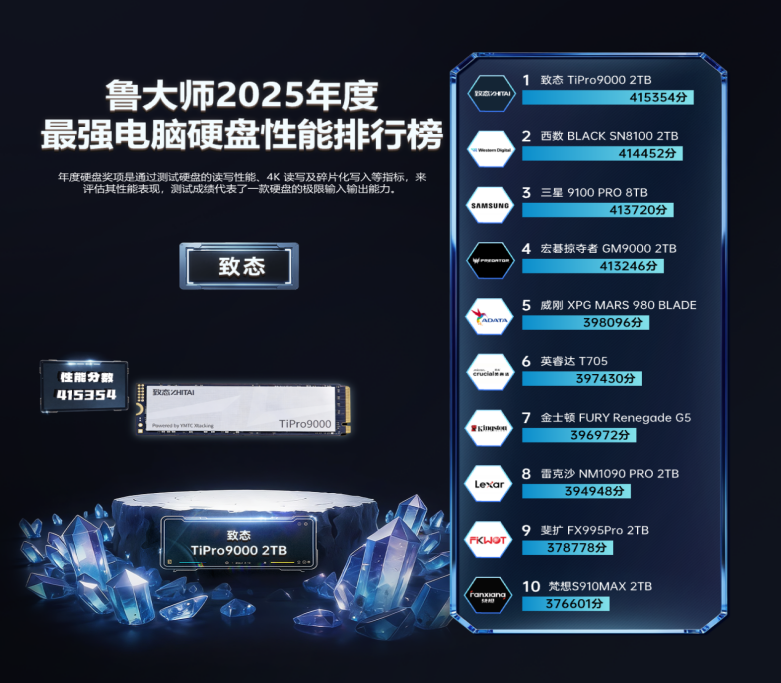 致态 TiPro9000 2TB获“2025年度最强电脑硬盘性能”。搭载晶栈Xtacking 4.0架构,它在PCIe 5.0赛道跑出14000MB/s级别读取表现,以自研闪存与主控构建持续写入与高负载吞吐能力,向行业展示了国产存储在高端性能区间的关键突破。
