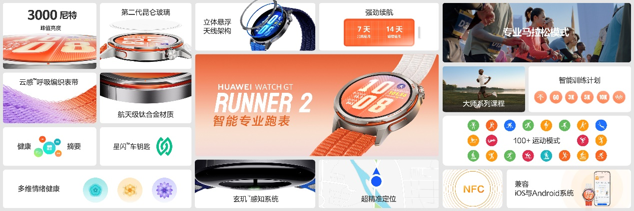 此次华为携手HUAWEI WATCH GT Runner 全球代言人、马拉松传奇基普乔格及其所属的帝斯曼-芬美意职业跑队联合共创,将顶尖跑者的专业运动经验与华为穿戴的创新科技深度融合。无感乳酸阈检测算法和跑步功率指标,更精准地帮助跑者安排训练强度、完成比赛。业界首发专业马拉松模式,不仅支持关注各类国际田联路跑标牌赛事信息,还提供赛前、赛中、赛后全流程指导,配合动态配速指导和智能补给提醒,根据赛程目标,在表盘实时显示规划配速和补糖补水提醒,助力跑者突破极限。
