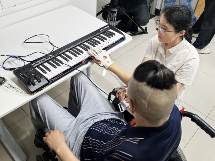 在团队成员协助下,患者尝试练习脑控弹琴。