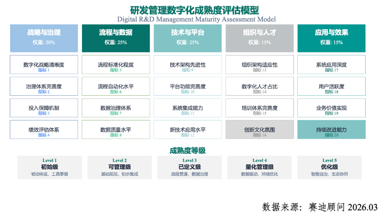 4月9日,赛迪正式发布《先进制造业研发项目管理数字化发展报告》。针对制造业向“质量跃升”中面临的研发周期压缩、试错成本高昂等核心痛点,报告拆解了研发数字化转型的全流程业务场景和价值模型,提出五维度成熟度评估体系及三阶段实施路径,并还原了当前研发管理工具市场的竞争格局。