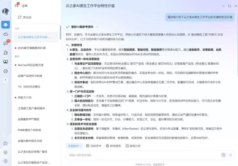 第三是AI智能助手小K,提供智能问答、工作任务规划、会议总结、流程快速发起等功能,自动处理重复性事务,辅助员工聚焦核心工作。