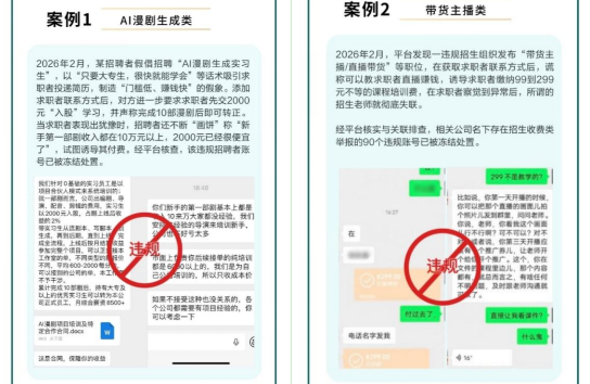 在和AI漫剧相关的违规案例中,一招聘者就以“只要大专生,很快就能学会”等话术吸引求职者投递简历,制造“门槛低、赚钱快”的假象。添加求职者联系方式后,对方进一步要求求职者先交2000元“入股”学习,当求职者表现出犹豫时,招聘者还不断“画饼”,辩解称“新手第一部剧收入都在10万元以上,2000元已经很便宜了”,试图诱导其付费。