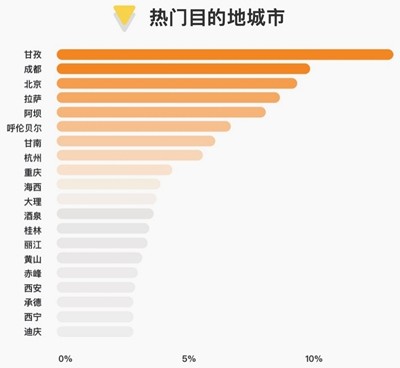 在目的地选择方面,自驾游游客更喜欢探索人少景美的中国“新秘境”。登顶马蜂窝“中国新秘境”城市榜单的四川甘孜,同样是自驾游客的最爱。阿坝、呼伦贝尔等旅游新秘境也是游客较为关注的自驾目的地。此外,北京、成都、杭州、重庆等一线和新一线城市人群,也会选择周末在城市周边自驾。