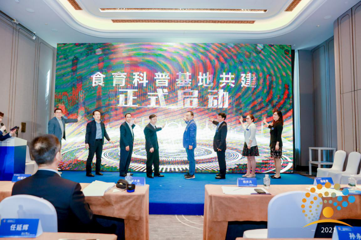 会上,中国食品科普与辟谣联盟宣布将联合相关行业协会、企业,共同打造“食育科普基地”。新华网副总裁杨庆兵与中国焙烤食品糖制品工业协会理事长张九魁、中国粮食行业协会总工程师赵奕奕、中国乳制品工业协会副理事长刘超、中国副食流通协会副秘书长高海伟、内蒙古蒙牛乳业(集团)股份有限公司副总裁杨晓君、无限极(中国)有限公司公关传播总监张前、康师傅控股东北区董事兼办公室主任姜克良,共同开启食育科普基地共建启动仪式。