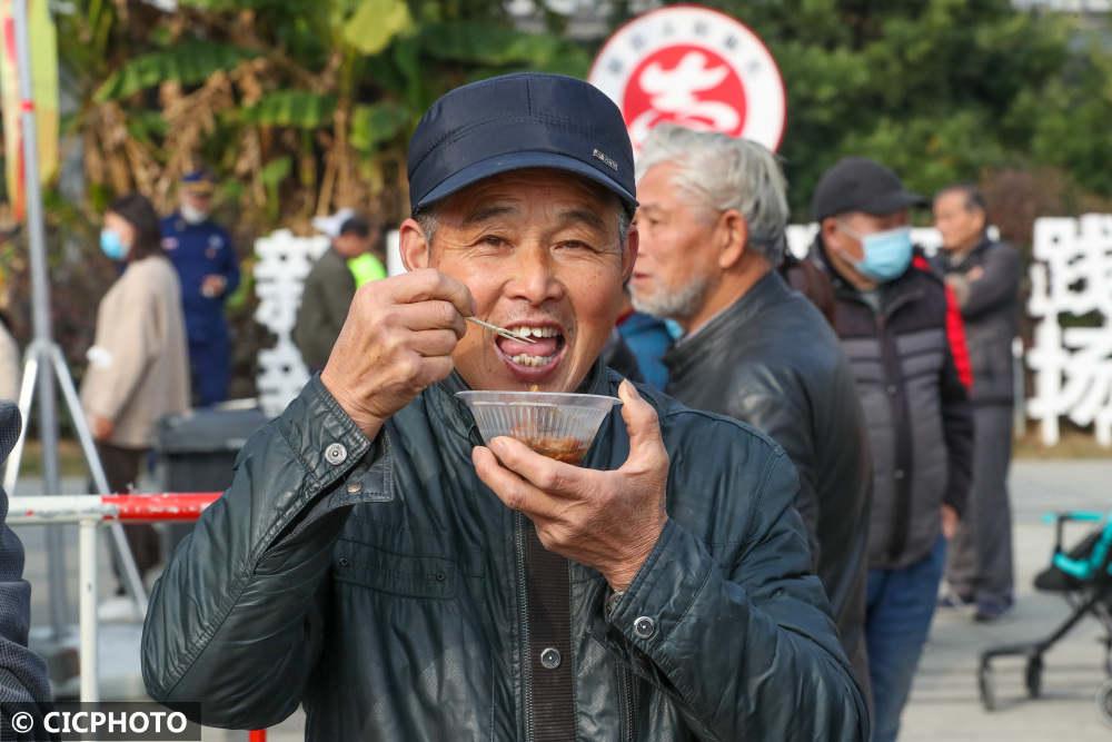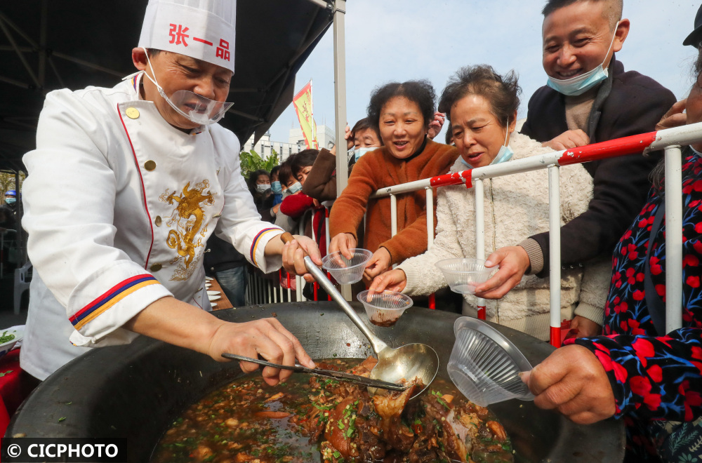 ↑2021年12月8日,在浙江省湖州市德清县新市镇羊肉黄酒节,游客和市民准备品尝羊肉。CICPHOTO/赵宁 摄